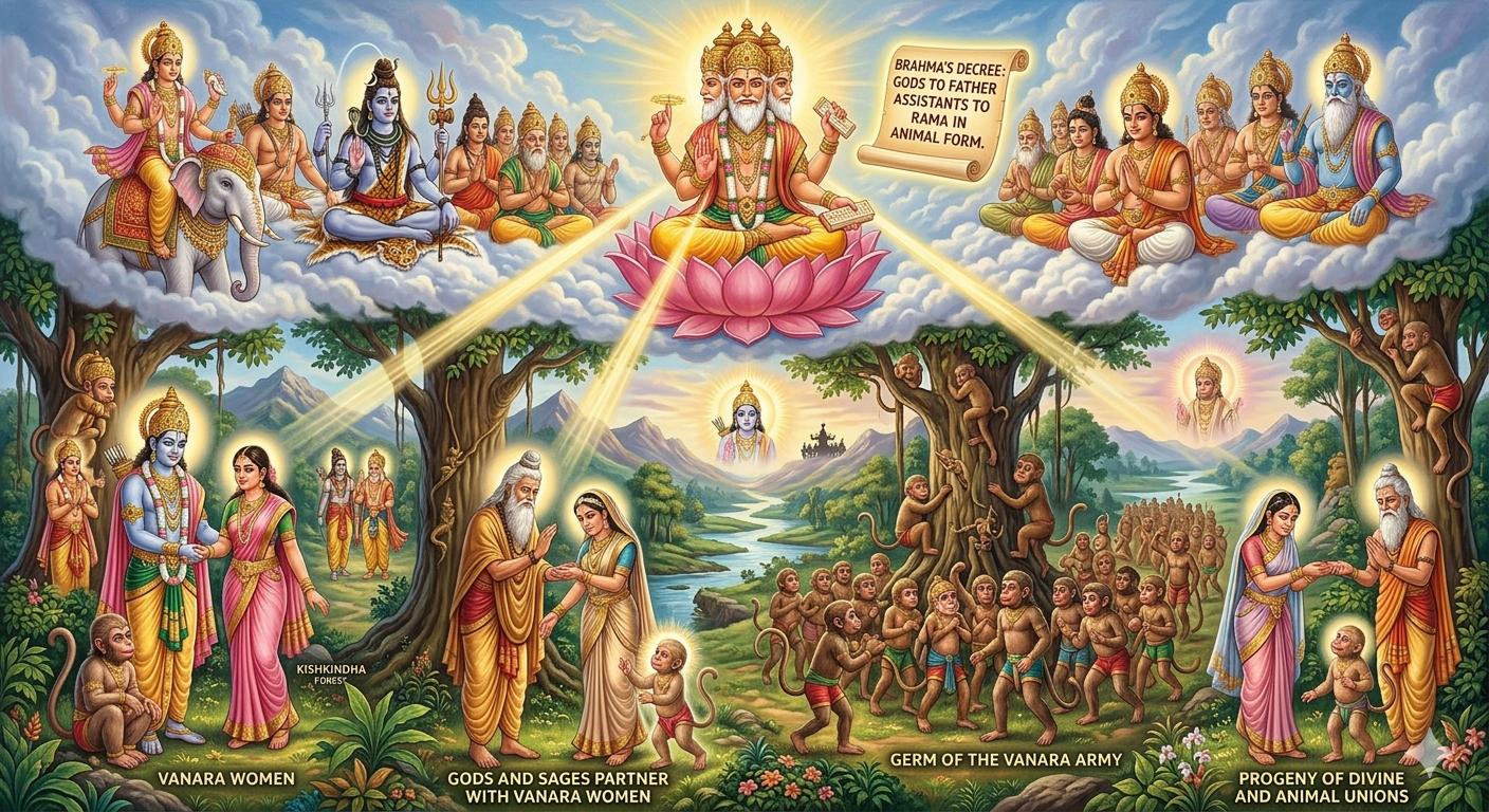 Core narrative: When Vishnu was about to incarnate as Rama to defeat Ravana, Brahma commanded the gods to father children on earth in animal form to assist Rama. The gods and sages mated with female monkeys (vanara women) to produce the vanara army.