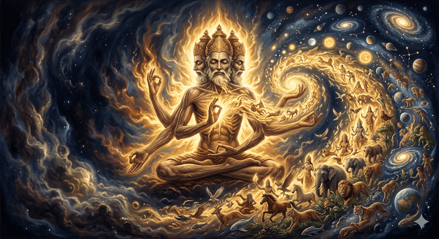 - Shatapatha Brahmana 11.5.8: Prajapati was unhappy being alone. He rubbed his hands together, generating heat (tapas). From that heat he produced a cosmic fire, then poured it as an offering into himself — from that self-offering came the universe and all beings.