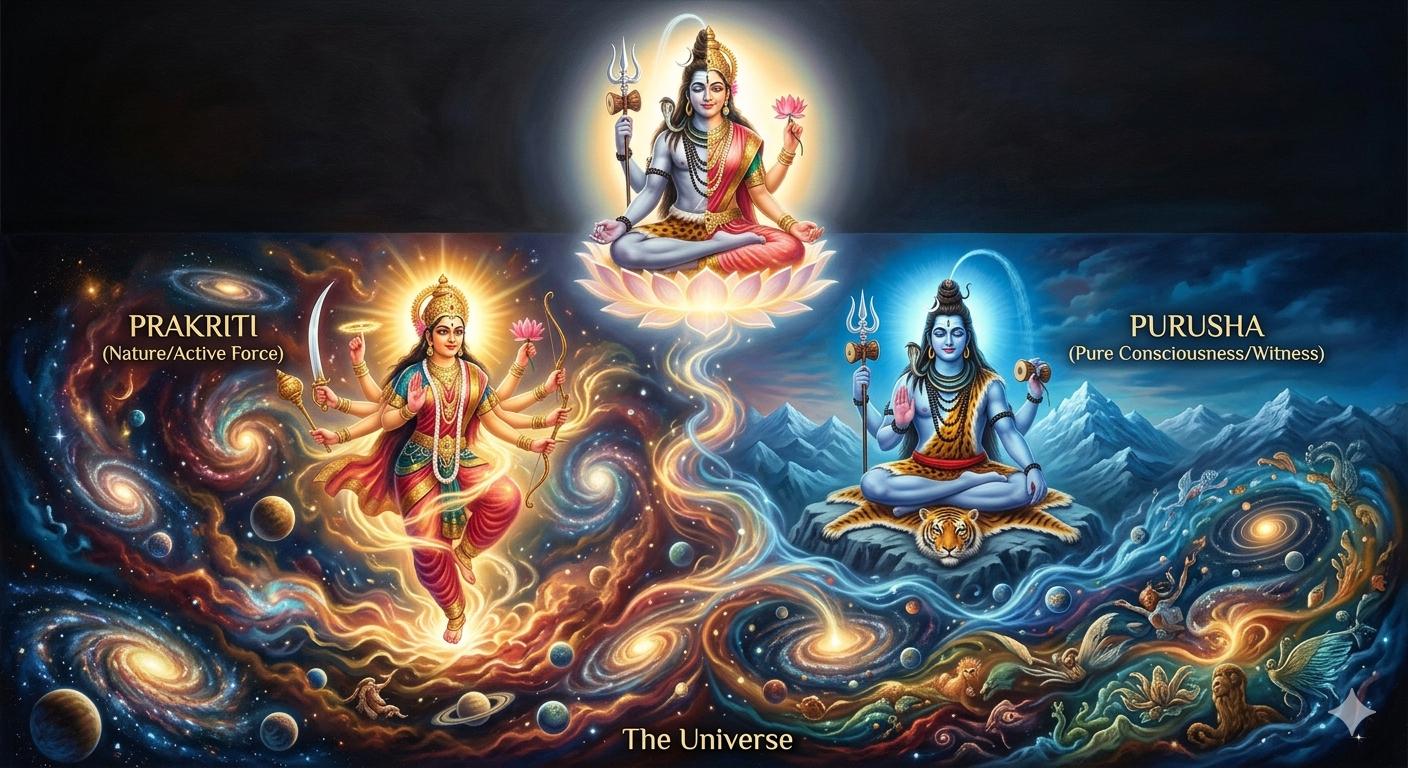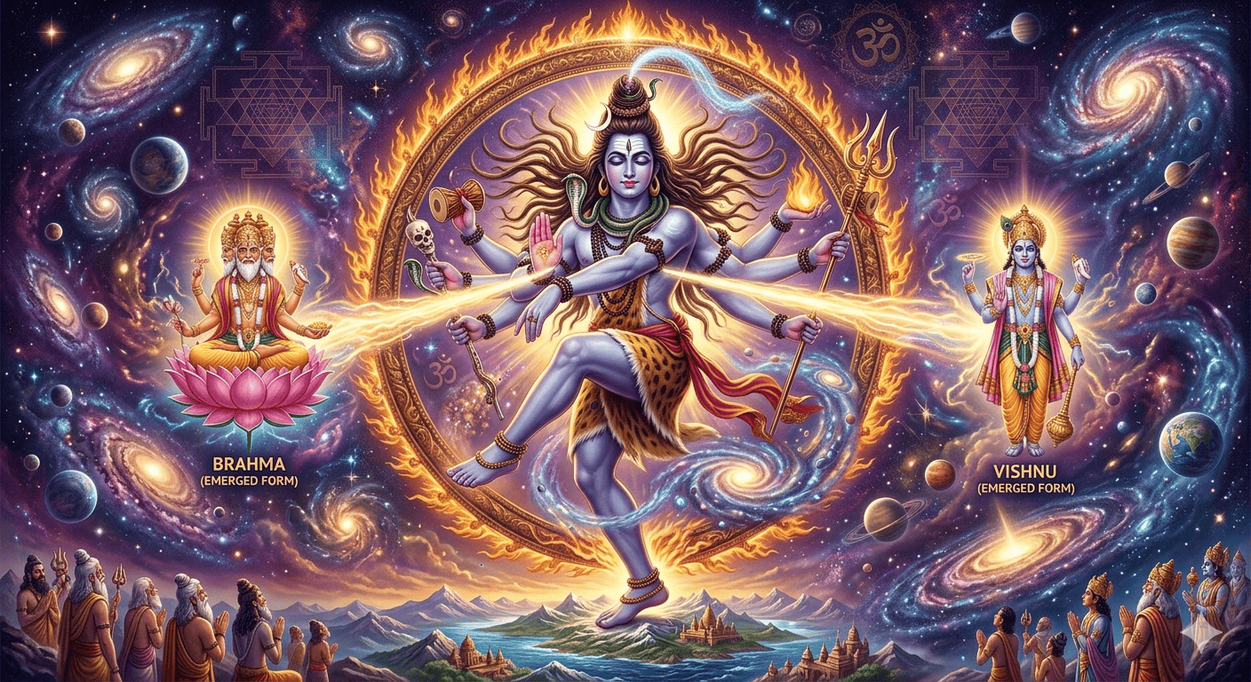 Core narrative: Before any creation, Shiva and Shakti existed as one undivided reality. Creation occurred when Shiva and Shakti separated — Shakti became the active creative force while Shiva remained the unchanging witness. The universe is the field of their interaction.