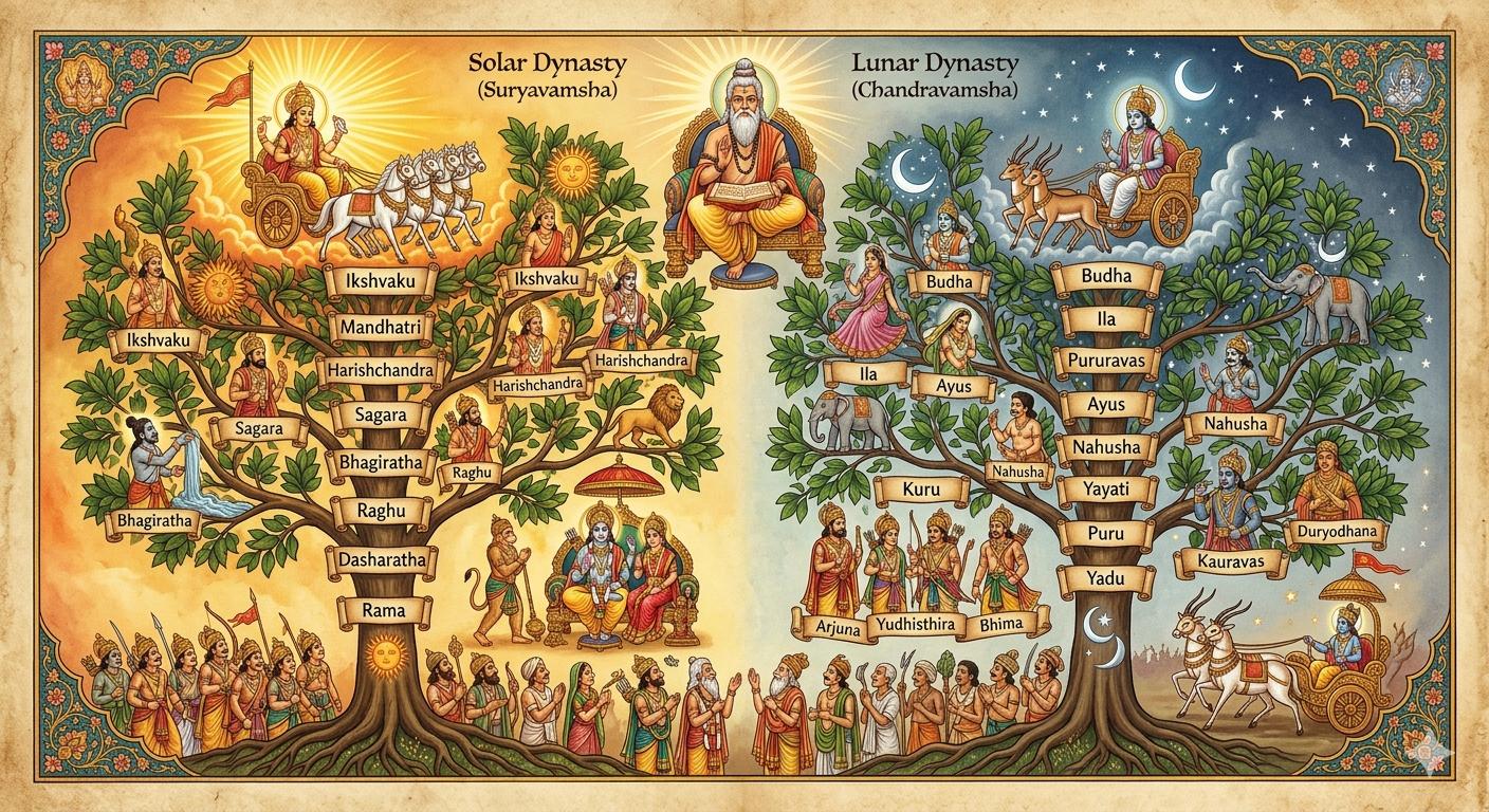 Core narrative: All human kings and heroes trace their lineage to either the Solar dynasty (Suryavamsha) descending from Manu through Ikshvaku, or the Lunar dynasty (Chandravamsha) descending from Manu through Ila/Budha. These two dynasties are the origin of all humanity in the epics.