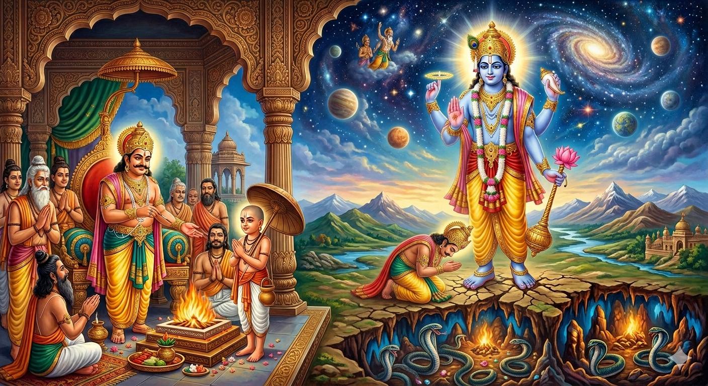 - Rigveda 1.154 (earliest): No dwarf, no Bali, no demon at all. Simply describes Vishnu taking three steps — one on earth, one in the atmosphere, one in the sky — establishing the three realms. This is purely a cosmic act, not a battle narrative.