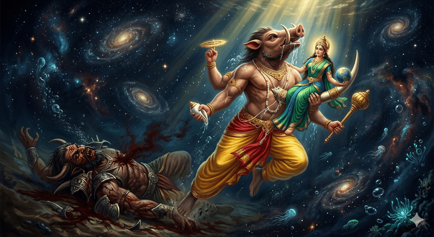 - Markandeya Purana 78.5-12: During the lotus-birth scene, two demons — Madhu and Kaitabha — emerge from Vishnu's ear wax and threaten Brahma. Vishnu wakes to fight and kill them before creation can proceed.