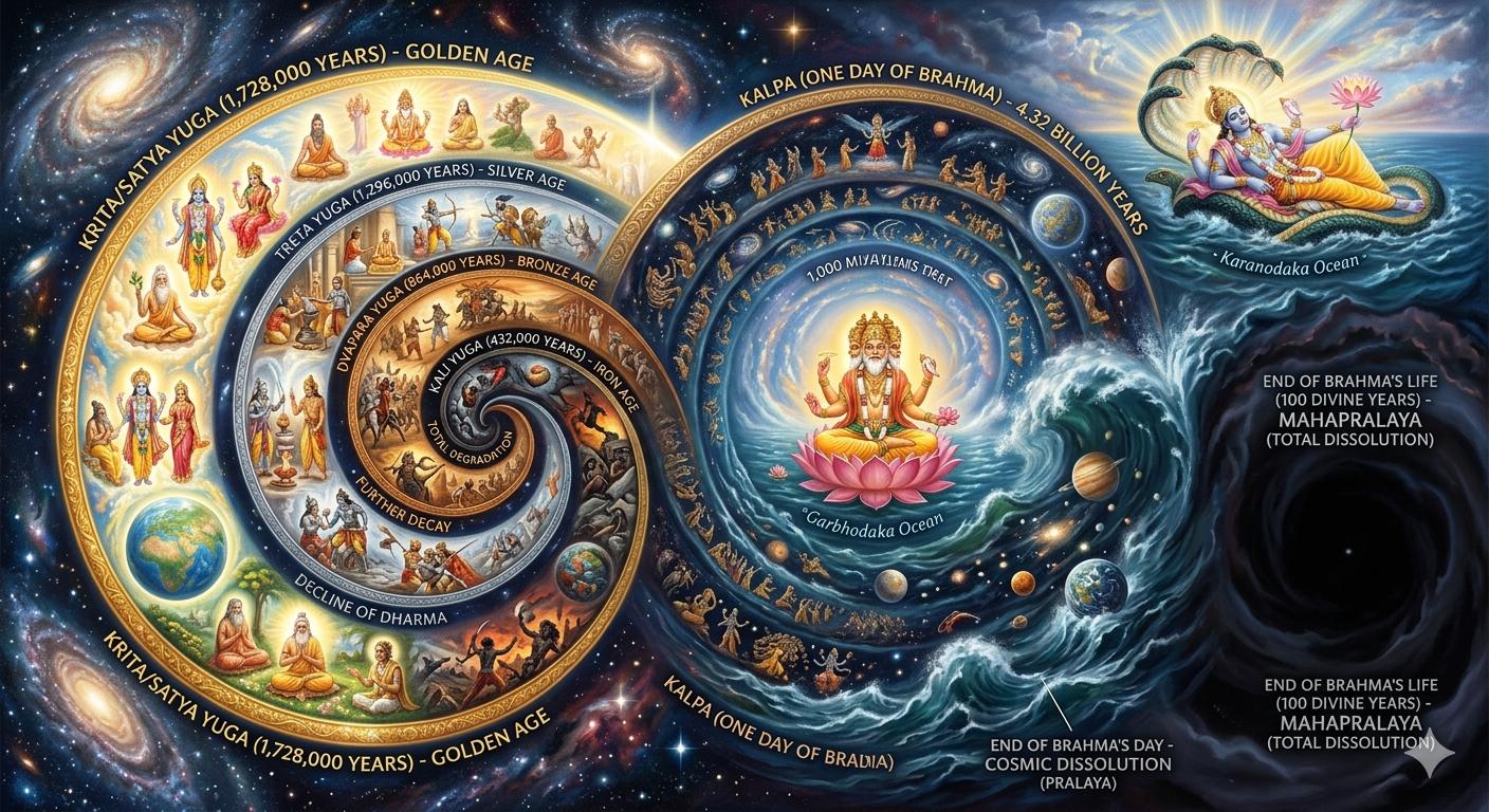 Core narrative: Time moves in cycles of four ages (Yugas) — Krita/Satya, Treta, Dvapara, and Kali — each shorter and more degraded than the last. 1,000 such cycles make one day of Brahma (Kalpa). At the end of each day, the universe dissolves (pralaya). At the end of Brahma's life, total dissolution (mahapralaya) occurs and everything returns to the unmanifest before the next creation.