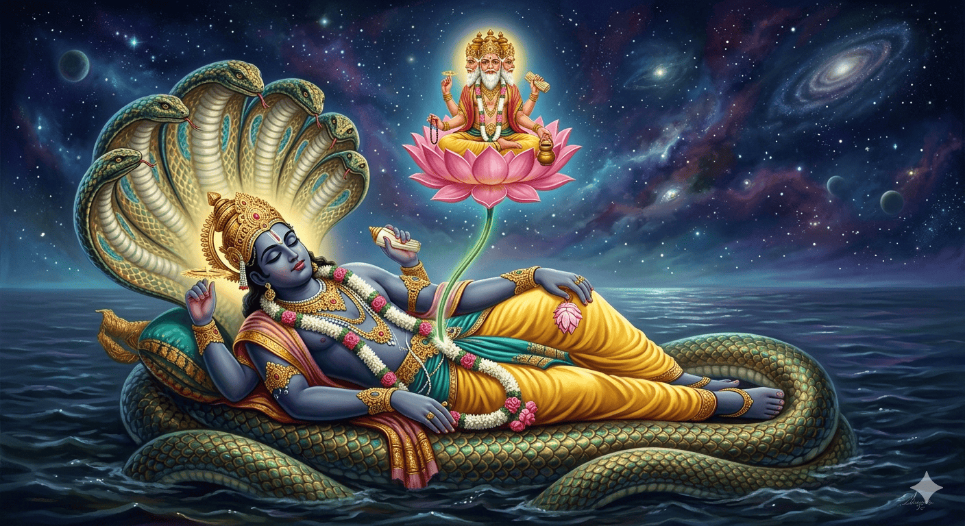 Core narrative: Vishnu lies sleeping on the serpent Shesha on the cosmic ocean. A lotus grows from his navel. Brahma is born on that lotus and begins creation.