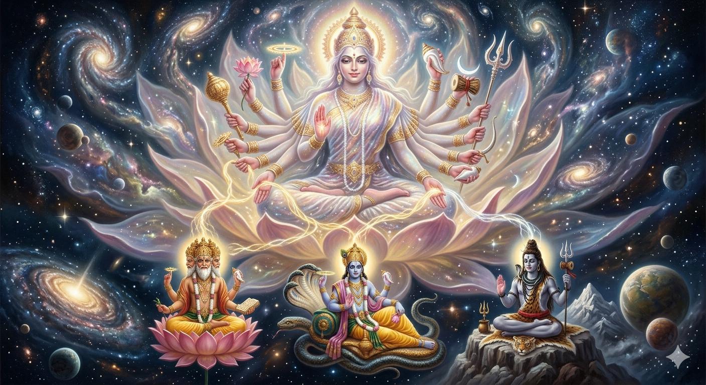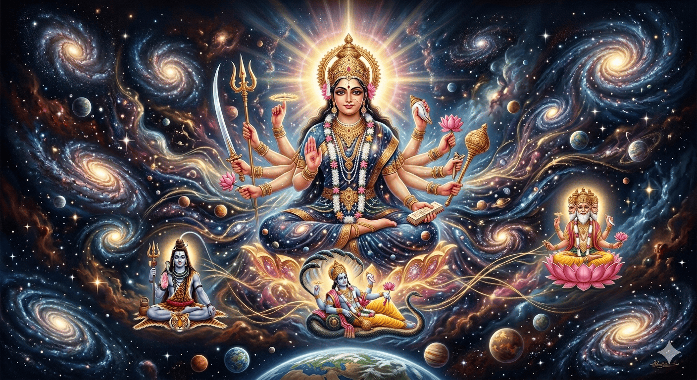 Core narrative: The Goddess (Adi Shakti) existed before everything — including Brahma, Vishnu, and Shiva. She is the material cause of the universe (what it is made of) and the efficient cause (the one who made it). All gods derive their power from her.