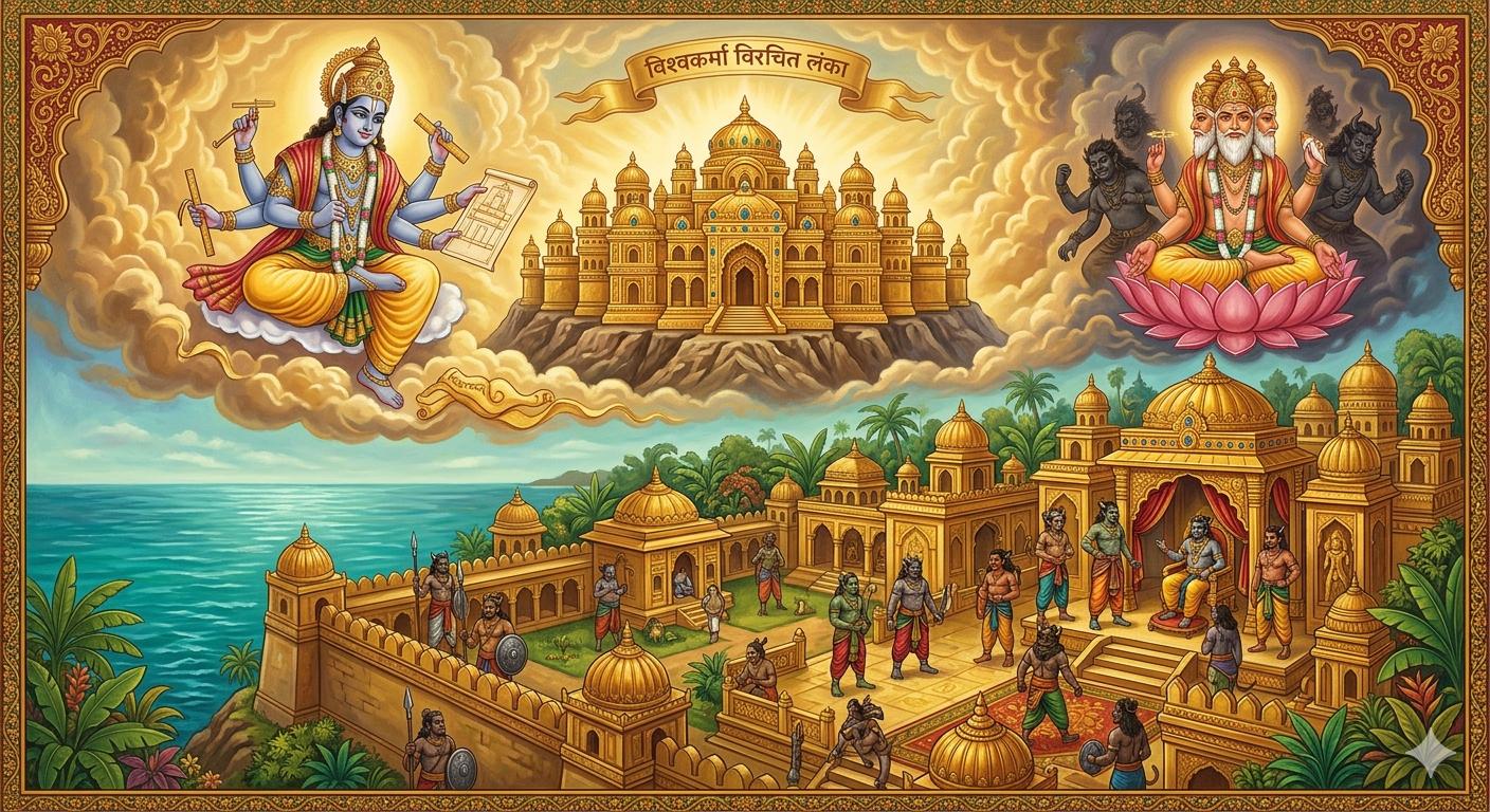 Core narrative: Lanka was originally a divine city built by Vishwakarma. The Rakshasas (demon beings) were born from Brahma's creation and inhabited Lanka before Ravana made it his kingdom.