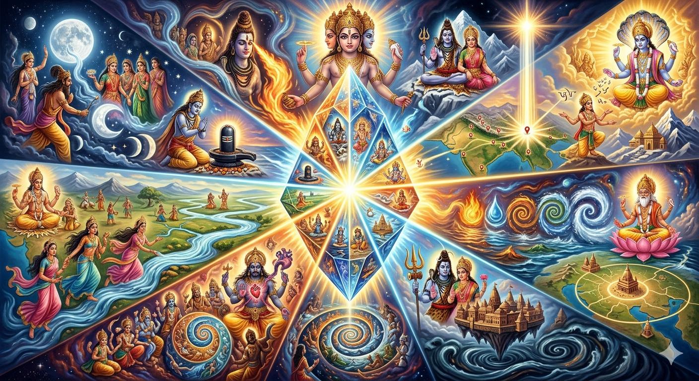 Core narrative: Before any creation, Shiva and Shakti existed as one undivided reality. Creation occurred when Shiva and Shakti separated — Shakti became the active creative force while Shiva remained the unchanging witness. The universe is the field of their interaction.